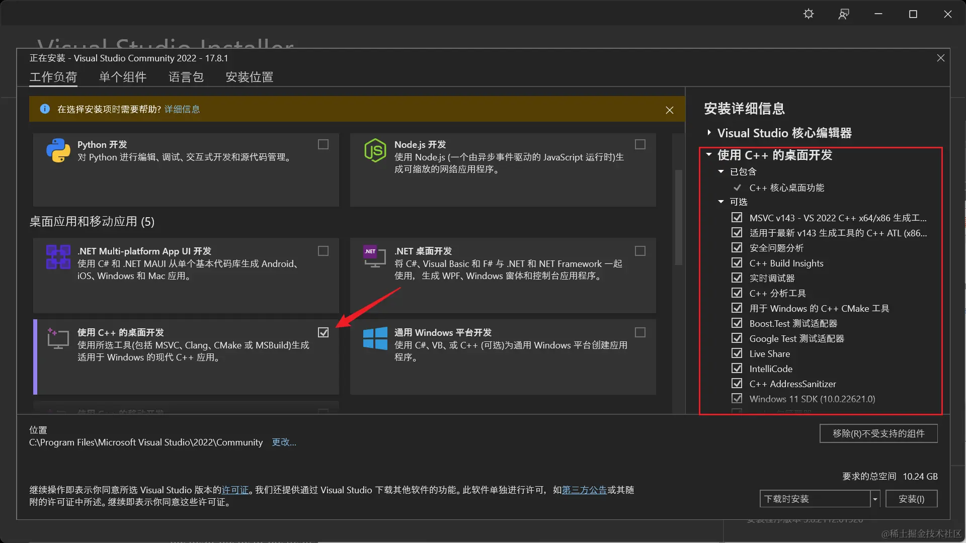 使用C++的桌面开发为例进行安装,勾选中该负荷,组件也保持默认: