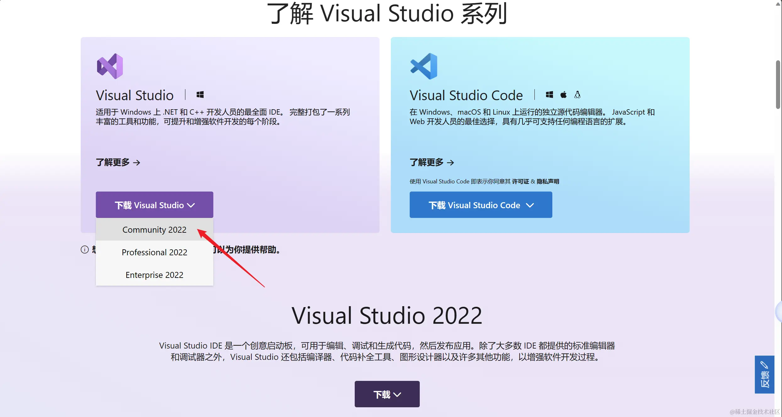 打开 Visual Studio 官网 visualstudio.microsoft.com/zh-hans/ ,个人选择免费的Community社区版就够用了: