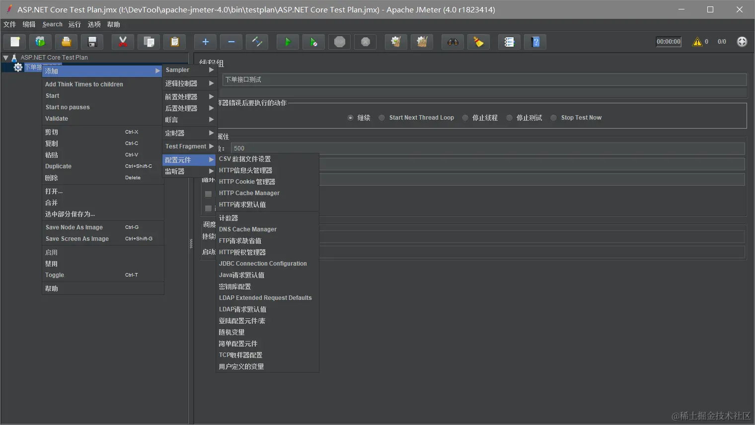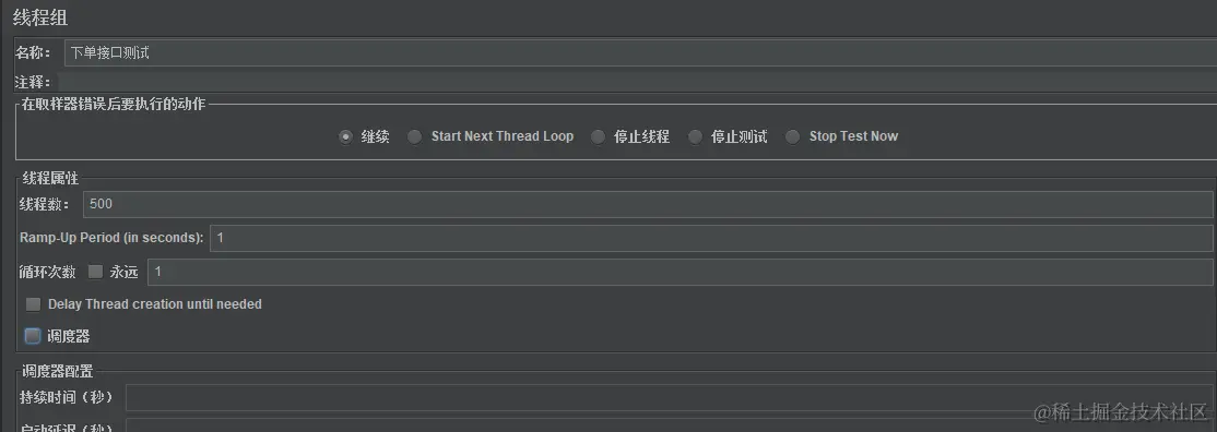 设置线程数和循环次数。我这里设置线程数为500,循环一次。