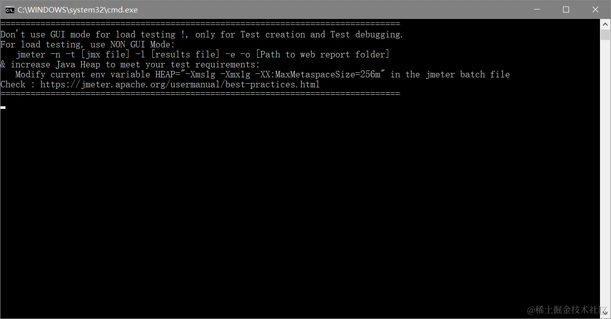 启动之后会有两个窗口,一个cmd窗口,一个JMeter的 GUI。前面不要忽略CMD窗口的提示信息: