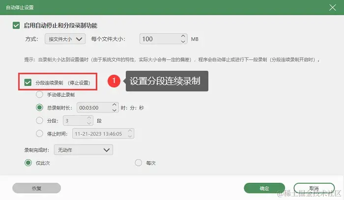 步骤3:此外,软件提供了自动停止功能,您可以根据文件大小、录制时长和停止时间三种方式来结束录制,还可以进行分段连续录制。