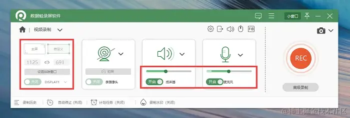 步骤2:在视频录制页面中,您可以选择录制全屏、区域或指定位置,并对录制的声音进行调整。