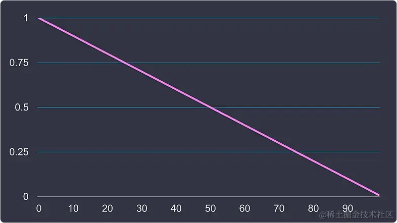 先选择线性衰减的方案。在此之前,让我们来看看任意参数下的曲线是什么样子的。从 ε = 1 开始,进入完全探索模式,并在每个游戏回合后将该值减少 0.001。