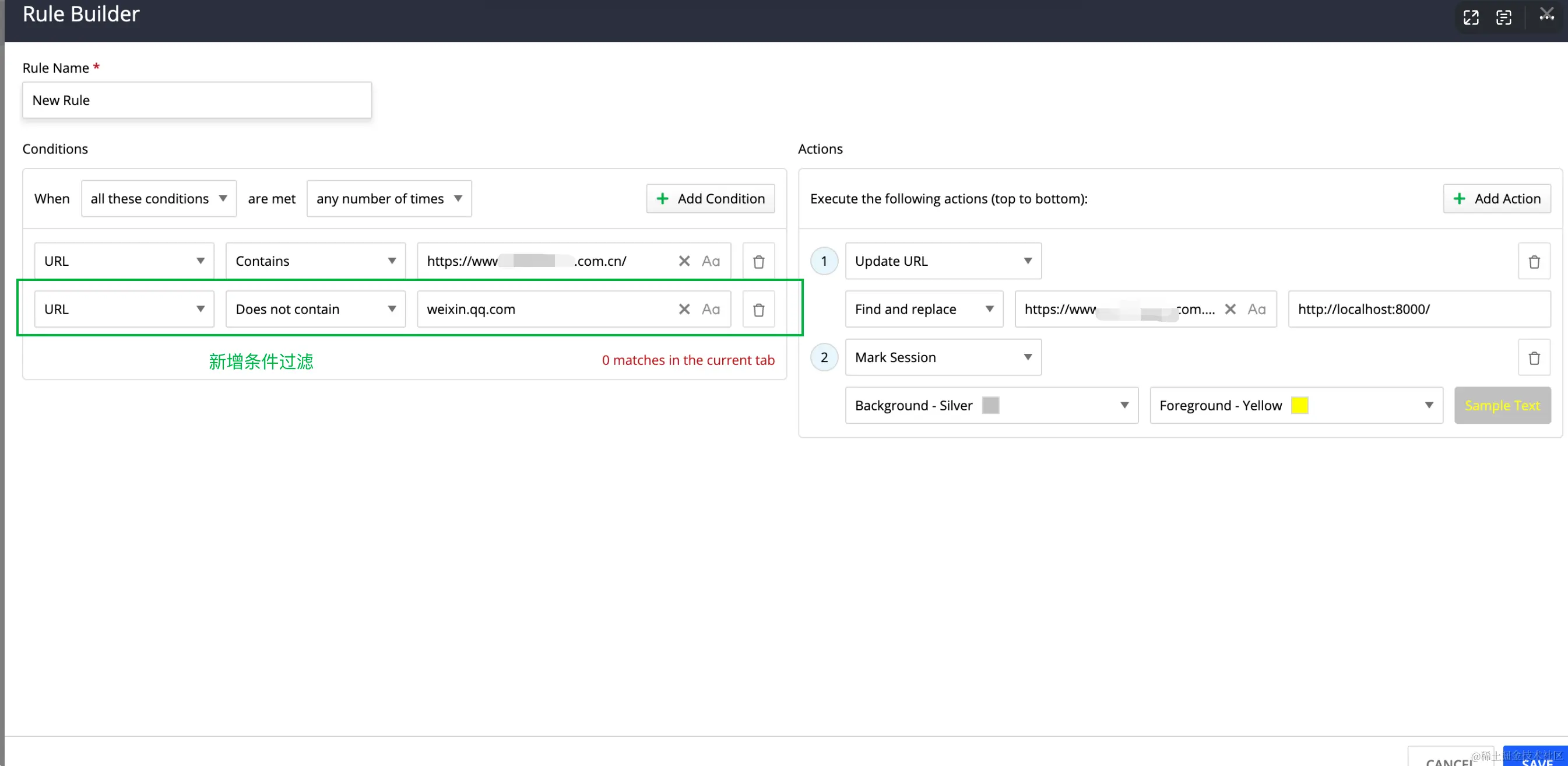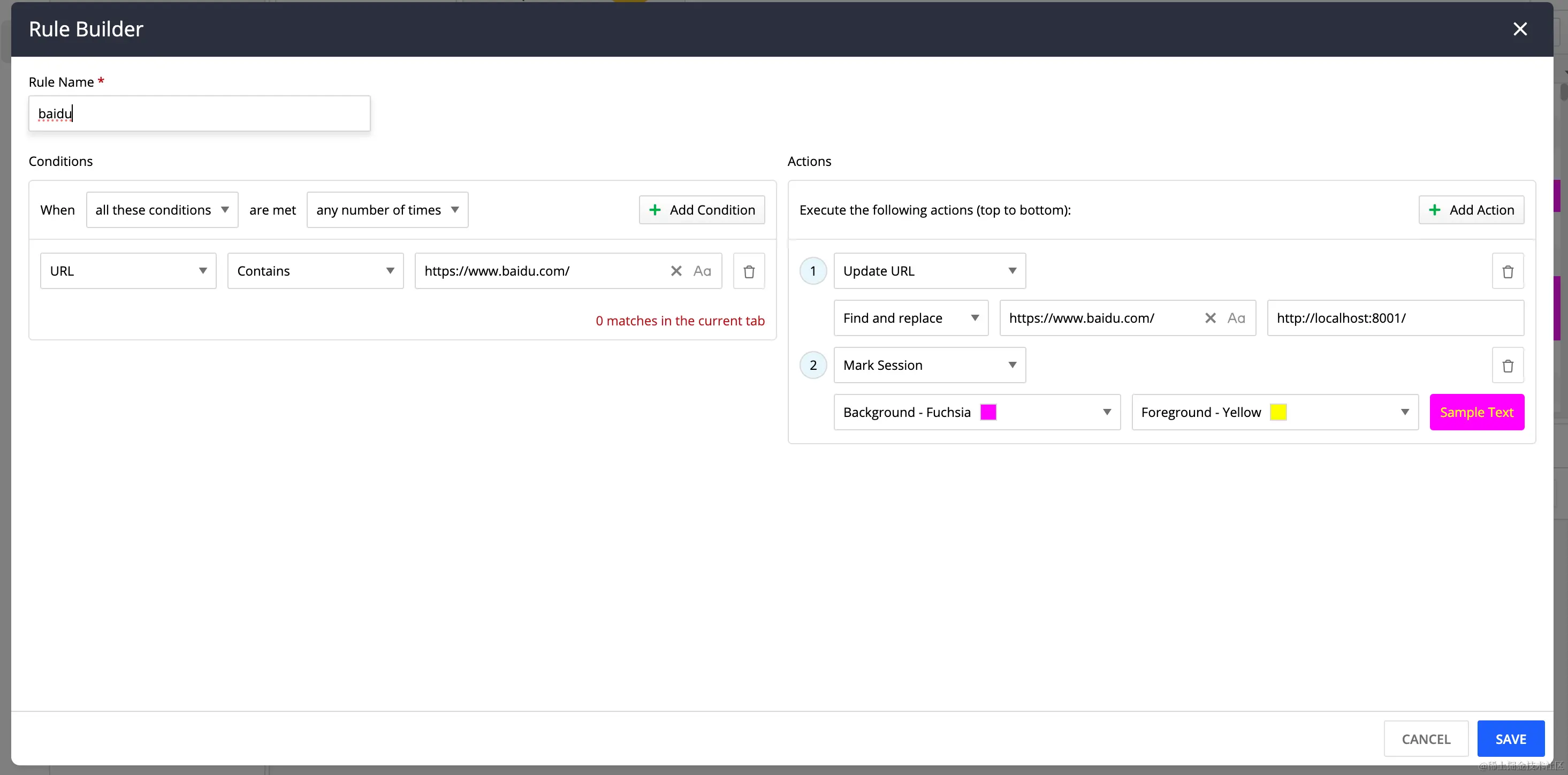 Actions: 触发行为 1. Update URL: 命中时替换https://www.baidu.com/为http://localhost:8001/ 2. 标记请求: 设置行背景色和文本颜色, 当 url命中时标记下