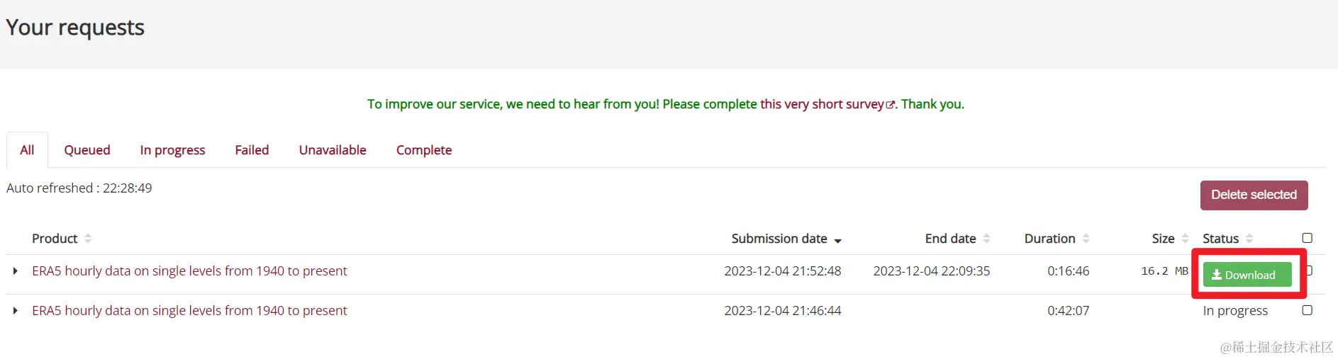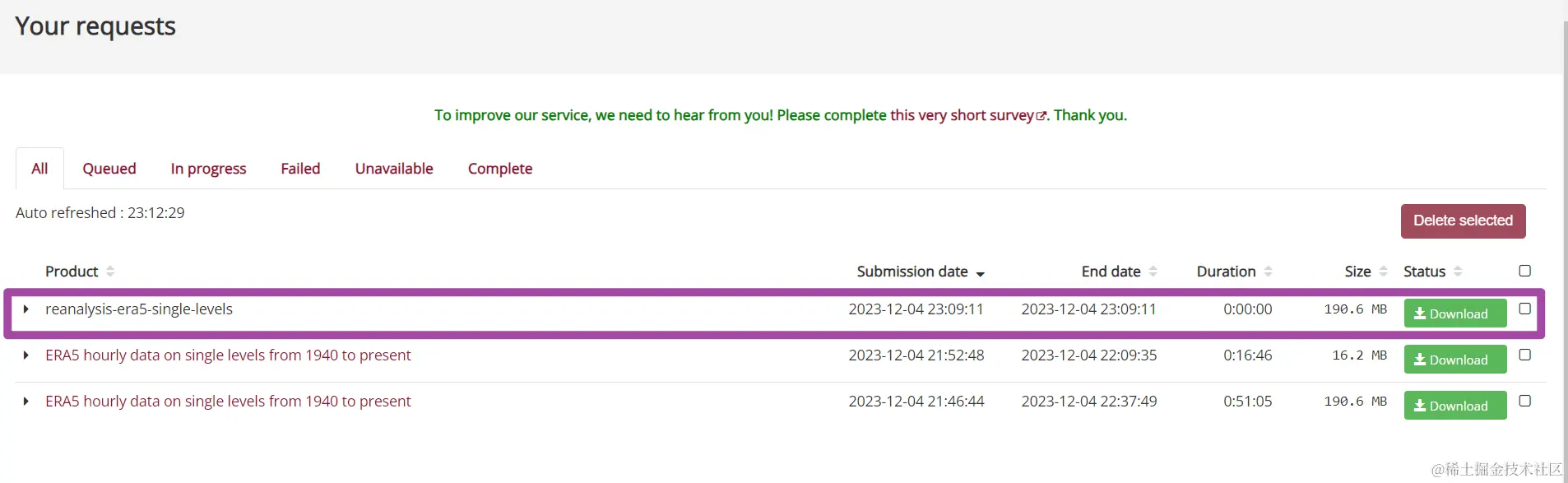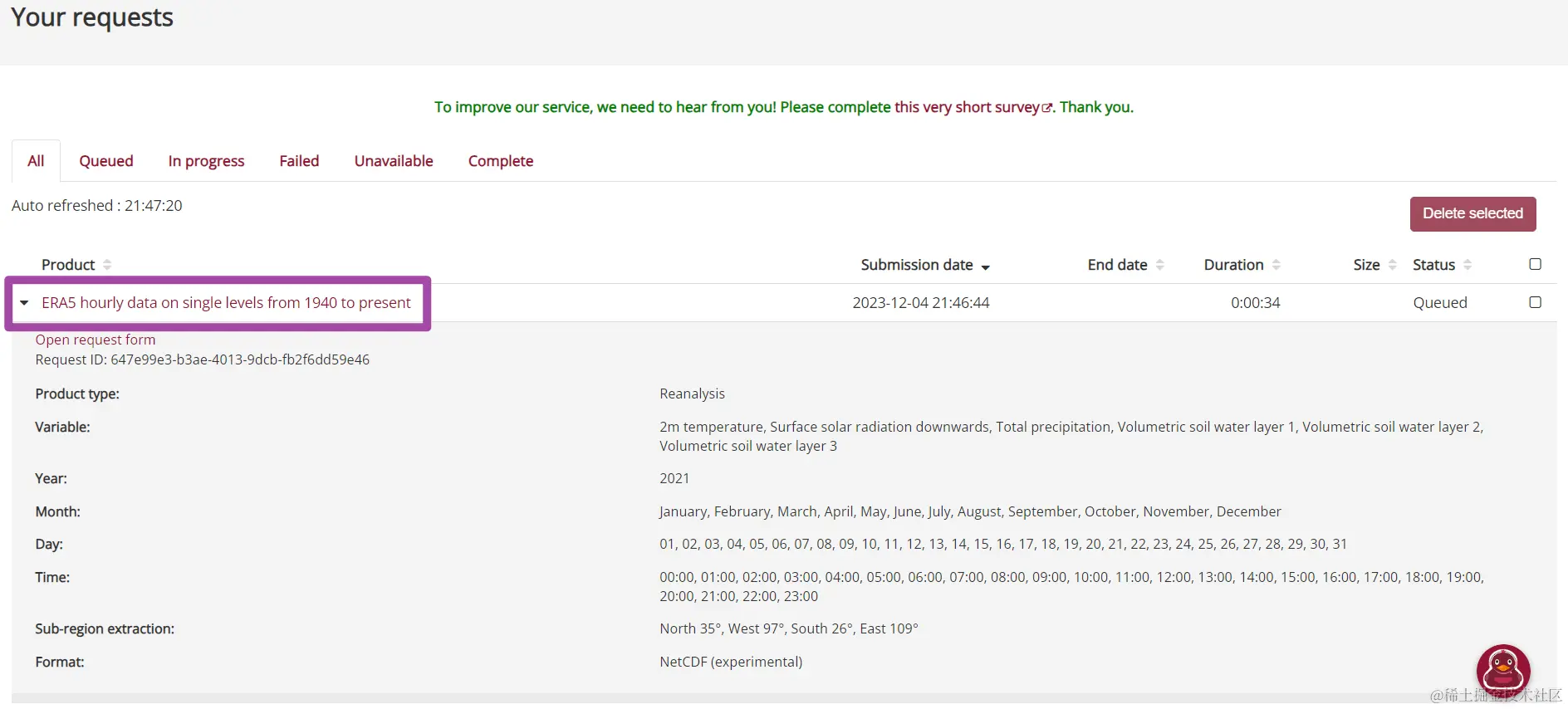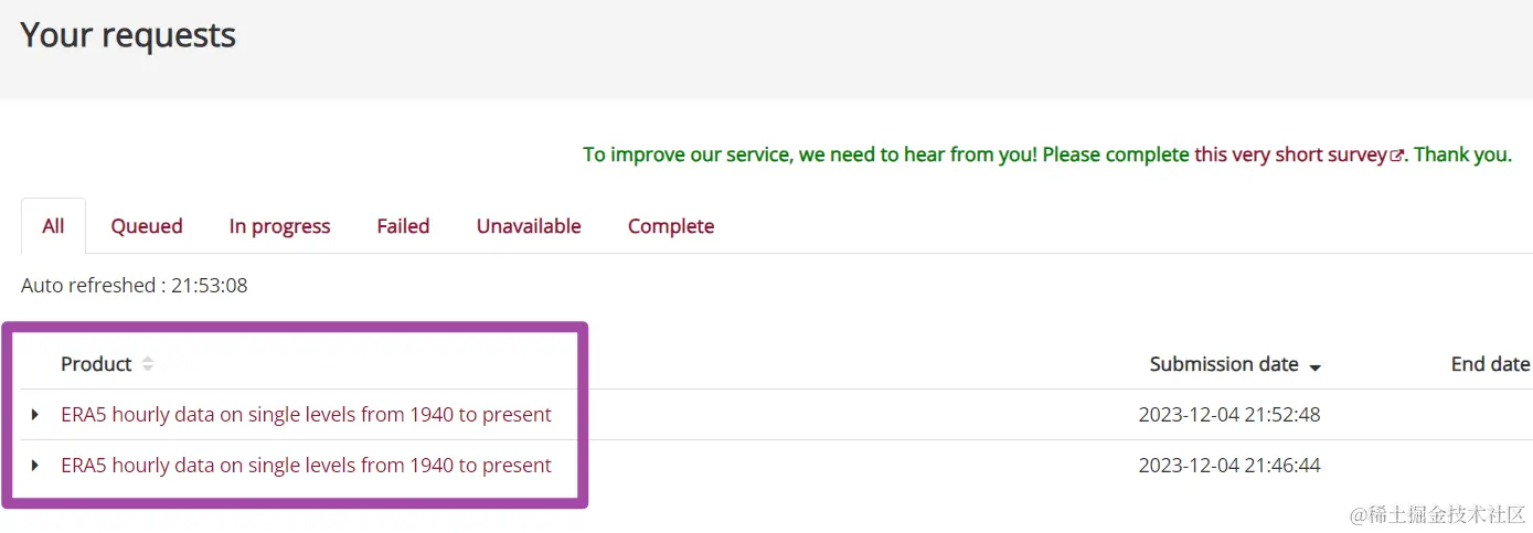 此外,我们通过上述方式获取的数据,其实也是一个向服务器发送的请求,也是需要首先处理请求、随后在Python中开始下载的;我们同样可以在“Your requests”页面中看到我们通过Python下载数据的请求。下图中,Python下载数据的请求处理数据为0,这个是因为对于同一个数据,我先用手动下载的方式提交过一次请求了,服务器处理之后我又用Python提交了一次请求,所以Python下载数据时就不用了再重新处理请求了。