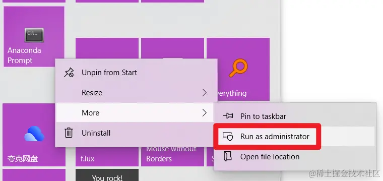 因此,选择用管理员权限打开命令行,如下图所示。