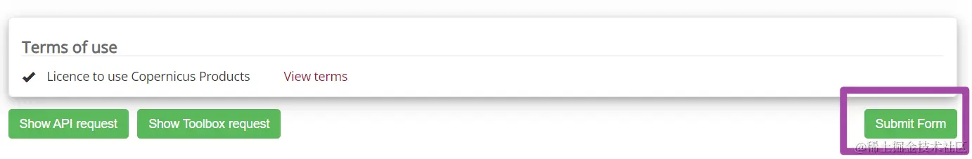 首先,我们介绍一下手动下载的方法。手动下载其实就很简单了,在完成上一个“Accept terms”选项步骤之后,上图右下角就会变成下图右下角所示的“Submit Form”选项;选择这一项即可。这个的意思是,将我们前面配置好的下载信息作为一个请求,发给服务器,服务器只要处理好这个请求,我们就可以开始下载了。