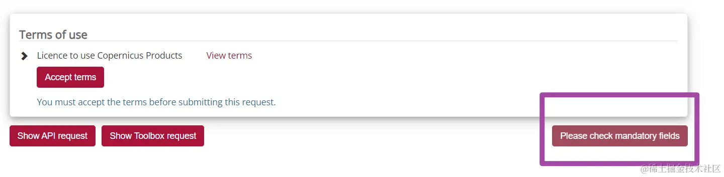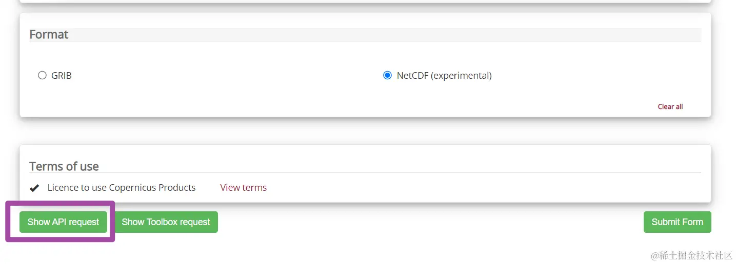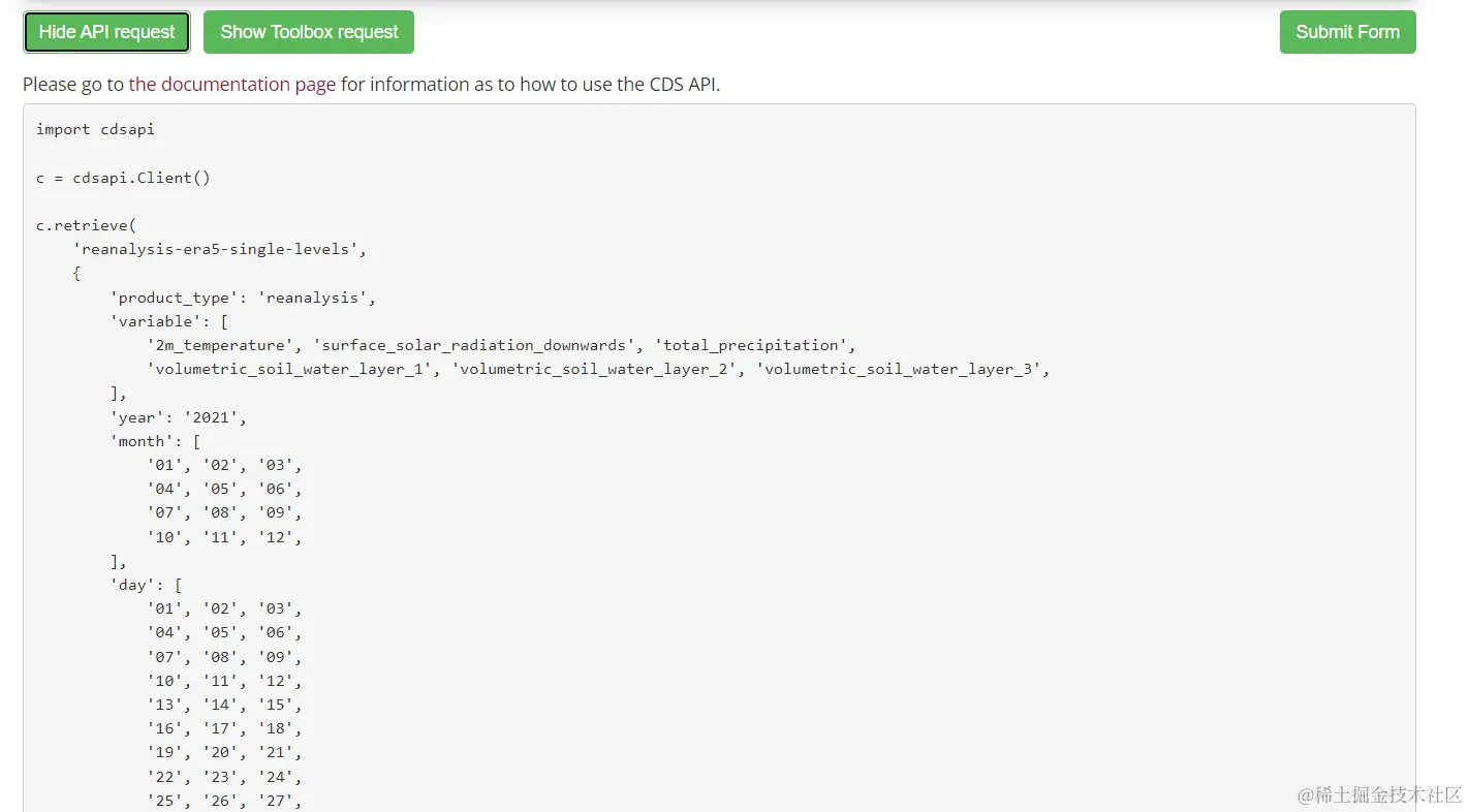 随后,我们回到前面ERA5官方网站中,设置下载数据属性的那个网站,并选择最左侧的“Show API request”选项;如下图所示。