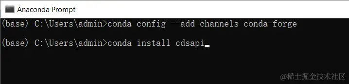 配置cdsapi库也是很简单的。我们直接在Python环境的命令行中分别输入如下代码即可(如果大家没有conda环境的话,可以用pip来安装,具体方法参考ERA5的官方网站即可)。其中,第一句代码用于在conda的配置文件中添加一个新的软件源channel,即conda-forge;conda-forge是一个社区驱动的软件源,提供了广泛的开源软件包,包括这个cdsapi库。第二句代码就是下载cdsapi库。