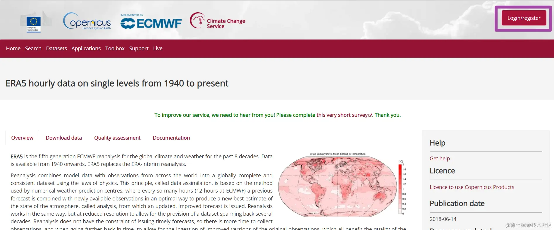 接下来,我们回到刚刚的数据首页中,选择“Download data”选项;如下图所示。随后,选择当前数据产品对应的产品类型,一般情况下,我们选择第一个,也就是“Reanalysis”选项就可以。