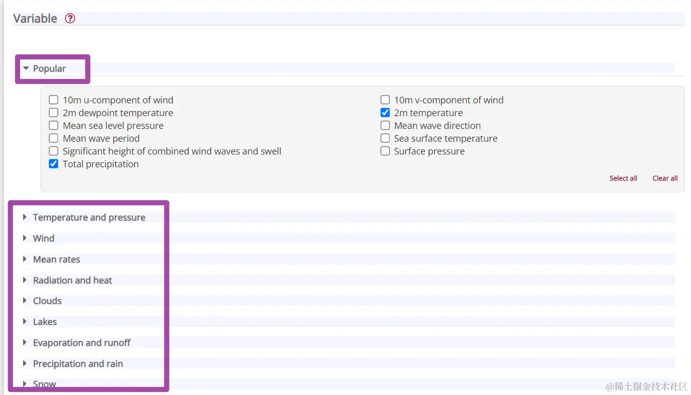 随后,选择我们需要的气象数据指标;可以在“Popular”这一栏选择用户常用的热门指标,也可以自己依据需要在下面的类别中搜索。如下图所示。