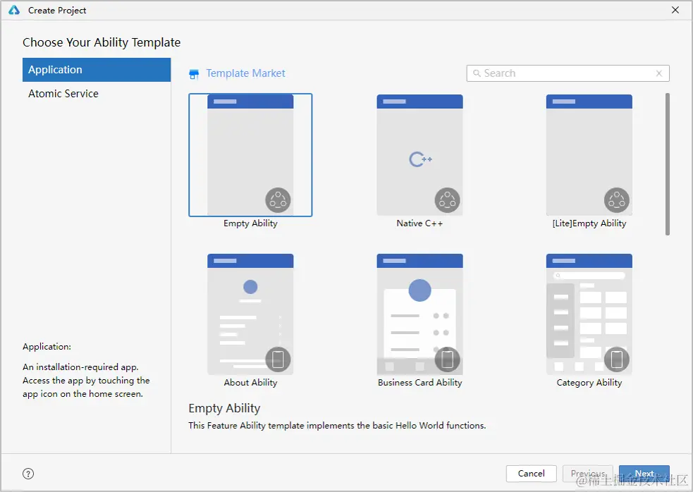选择Application应用开发(本文以应用开发为例,Atomic Service对应为元服务开发),选择模板“Empty Ability”,点击Next进行下一步配置。
