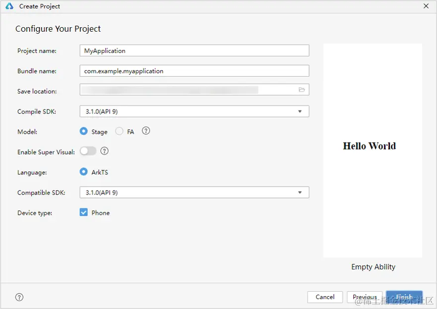 进入配置工程界面,Compile SDK选择“3.1.0(API 9) ”,Model 选择“Stage”,其他参数保持默认设置即可。