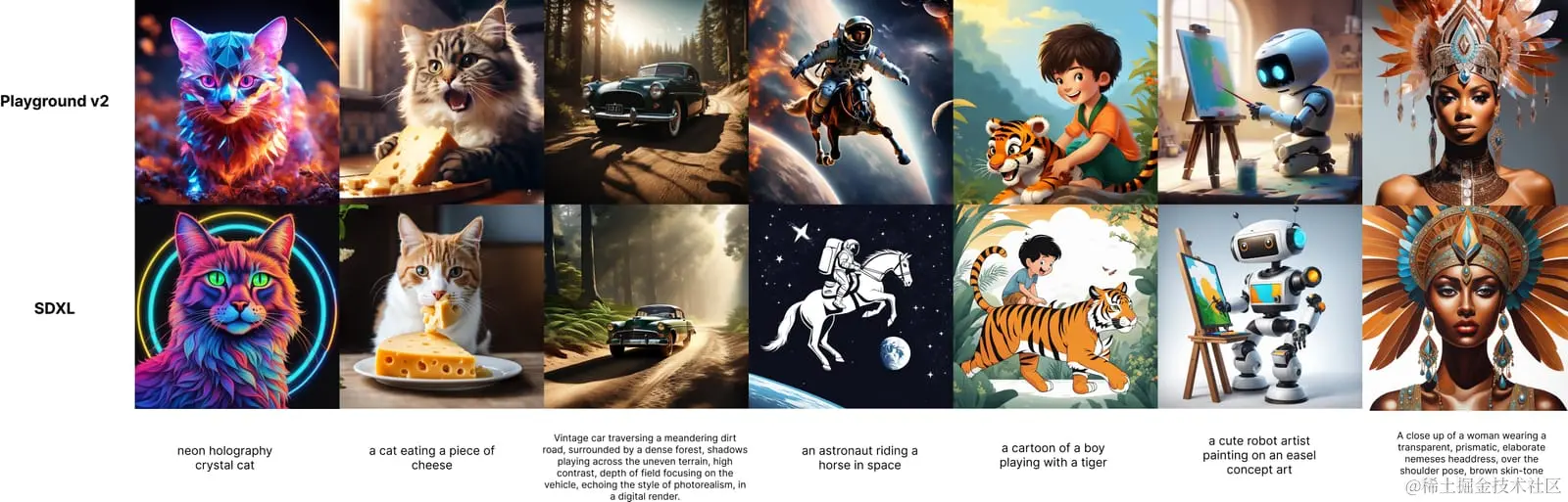 在AI图像生成领域,Playground v2以其卓越的性能,超越了Stable Diffusion XL(SDXL),成为了新的行业标杆。根据最新的评估,根据用户评价Playground v2的生成效果比SDXL强2.5倍,这一飞跃不仅标志着技术的进步,也为AI美学的发展开辟了新的道路。