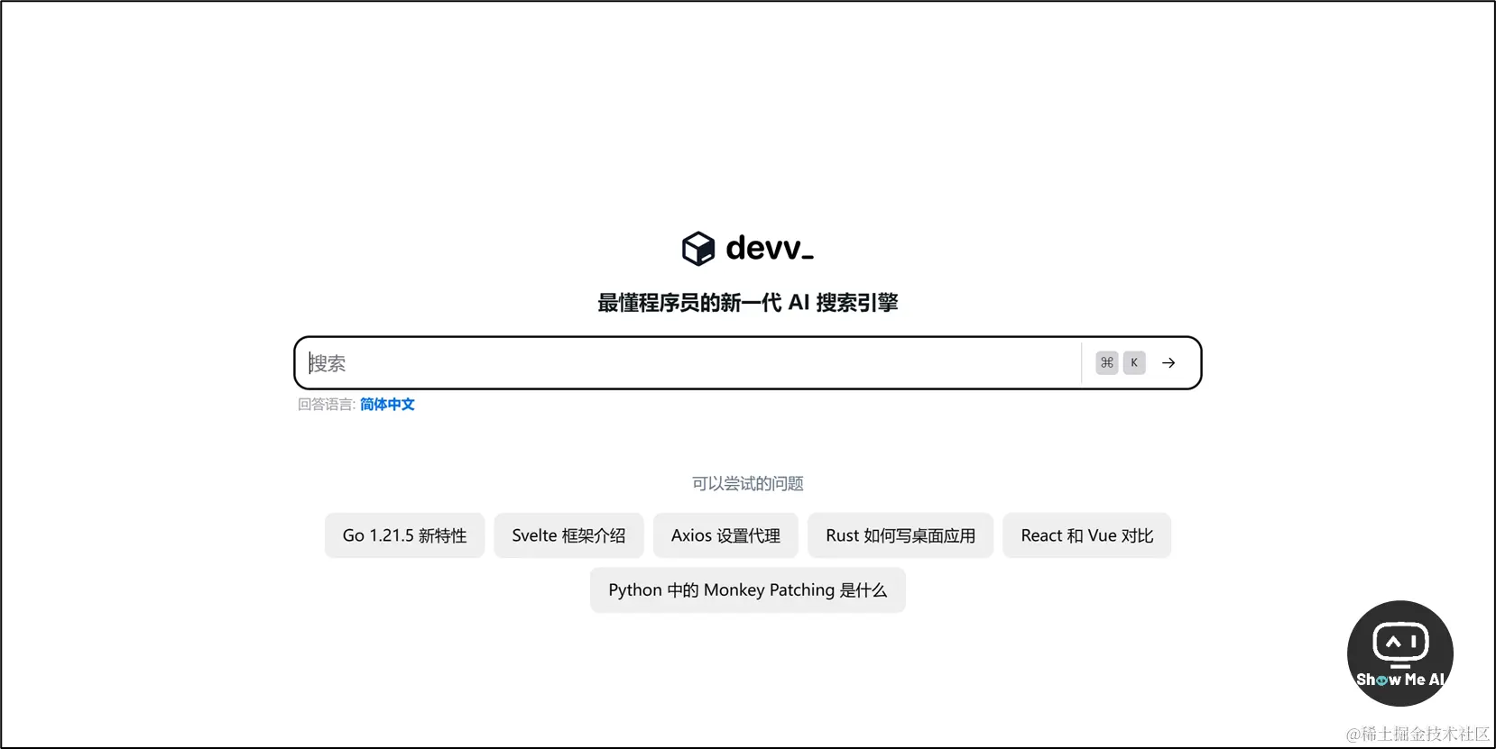 devv.ai 是专门面向开发者的 AI 搜索引擎,目标是替代开发者日常使用 Google / StackOverflow / 文档等进行查询的场景,更加快速地处理 coding 过程中的问题。
