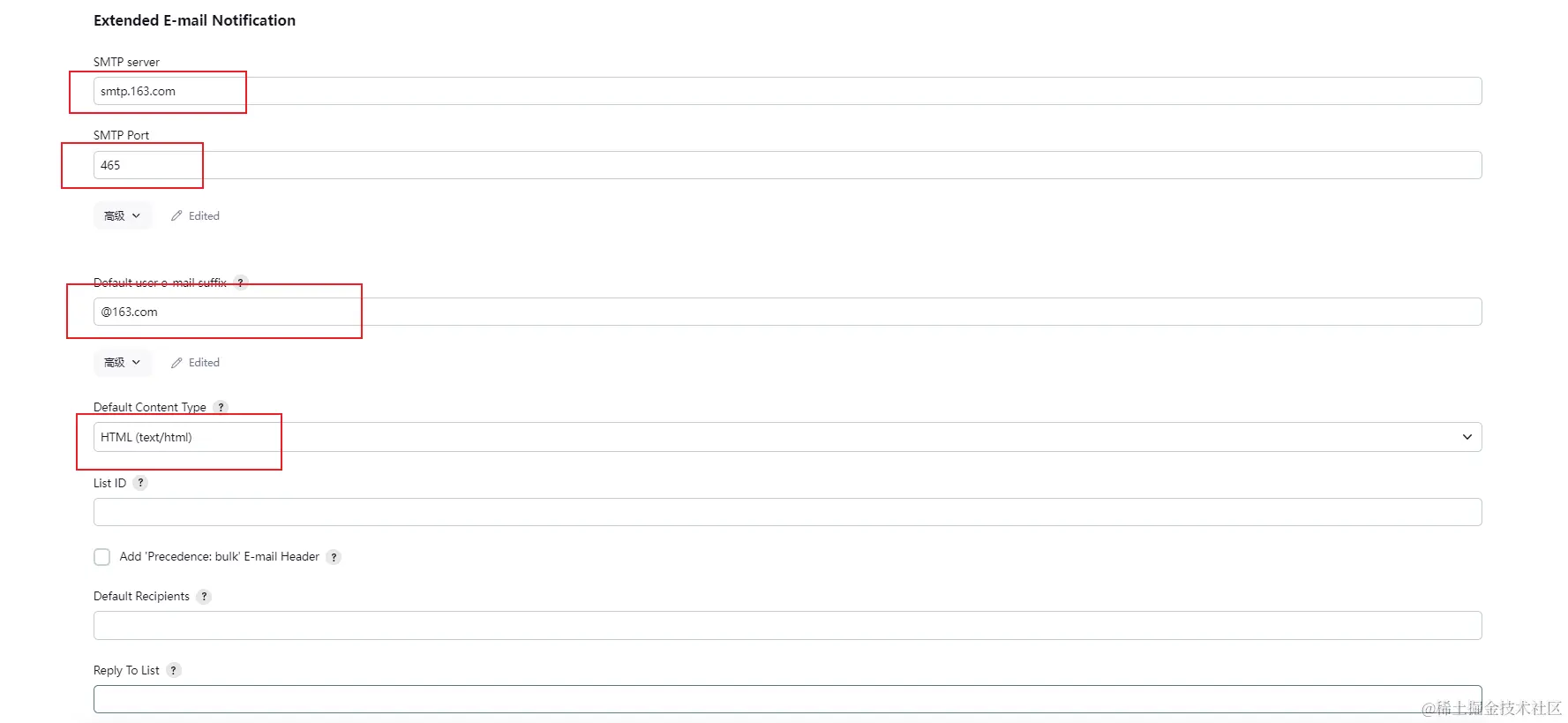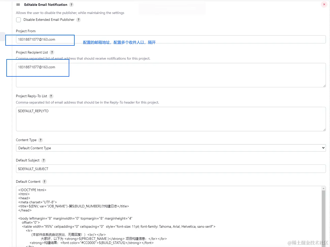 2. Extended E-mail Notification模块,填写邮箱信息