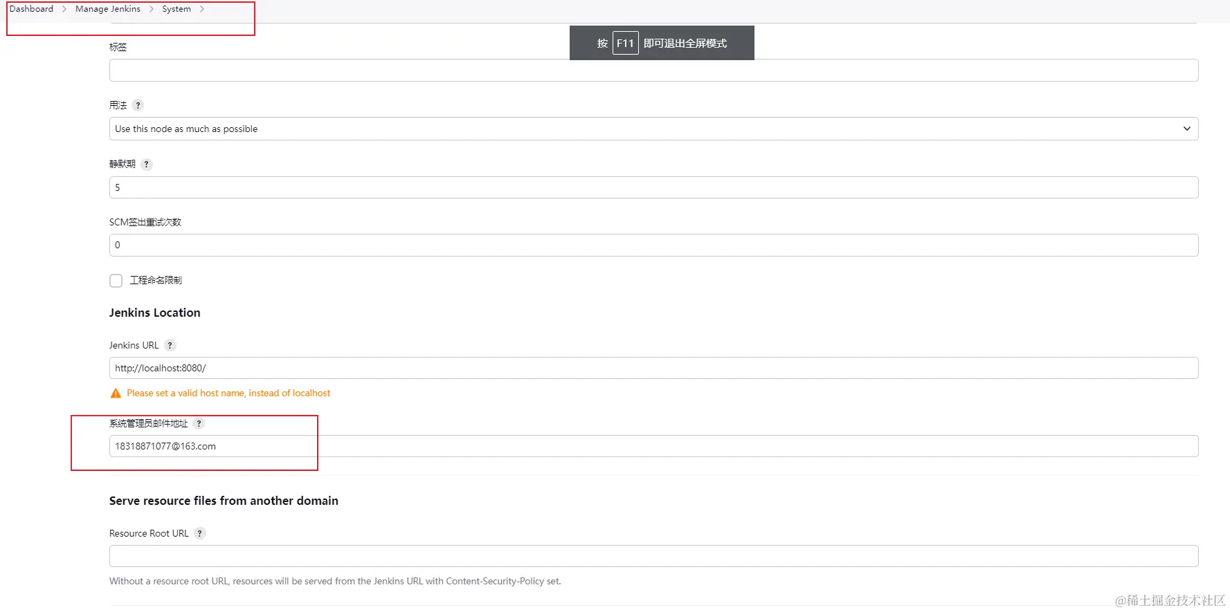 注: 在Jenkins Location中配置系统管理员的邮箱地址,不进行配置的话将无法发送邮件