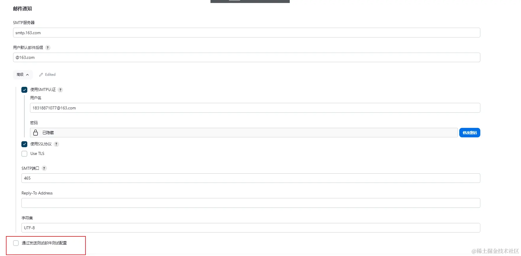 3.邮件通知模块,如图配置好后,勾选通过发送测试邮件测试配置后,填写与配置邮箱相同的地址,测试能否收到邮件,收到下方的邮件代表配置成功
