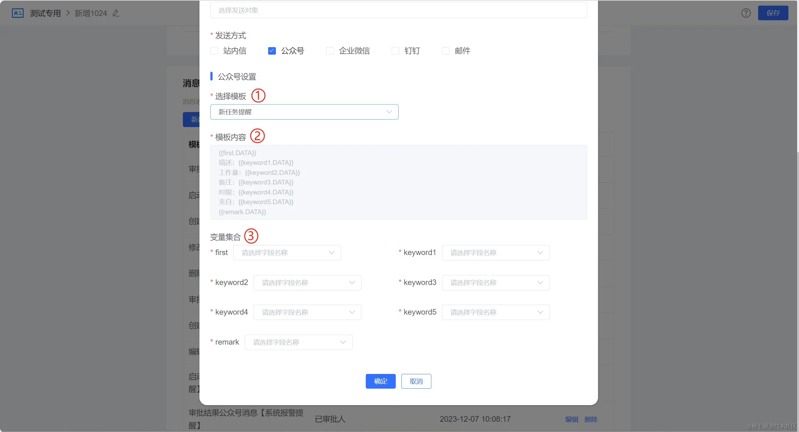 ①:选择模板,勾选公众号发送方式后,显示公众号设置-选择模板(系统已同步的消息模板)。
