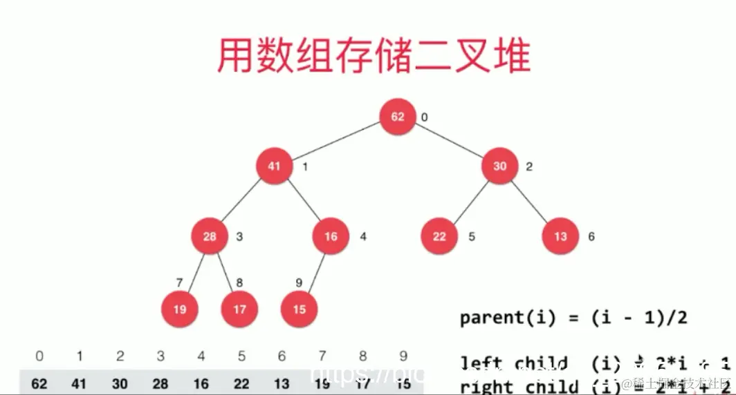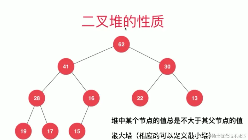 二叉堆首先是一颗完全二叉树,除此之外它还有一个非常重要的性质,在堆中某个节点的值总是不大于其父节点的值,就是所有的父节点的值都大于等于它的孩子节点的值,这就是最大堆,反之就是最小堆