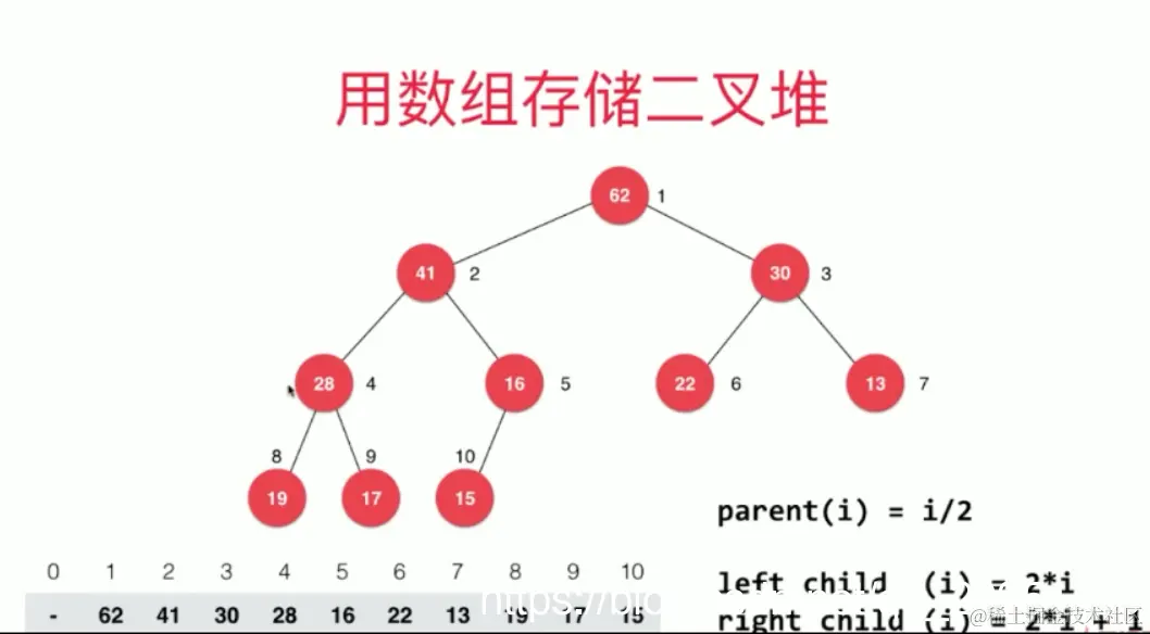 完全二叉树的特点其实就是一个个节点按顺序一层一层的放下来,所以可以用数组的方式来表示一颗完全二叉树,那么问题就来了,在数组中的每个节点,如何找到它的左右孩子是谁呢,仔细观察是存在如下规律的