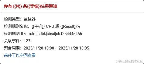 在指定事件内容时,我们可以借助模板语法来实现。接下来,我们会以几种常见的场景,展示事件内容通知的实际编辑效果。