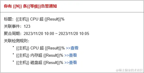 除了如场景一这样直接展示事件中的字段值外,我们还可以使用模板函数对字段值进行进一步处理。采用模版函数能优化事件的通知内容输出,整合必要信息。