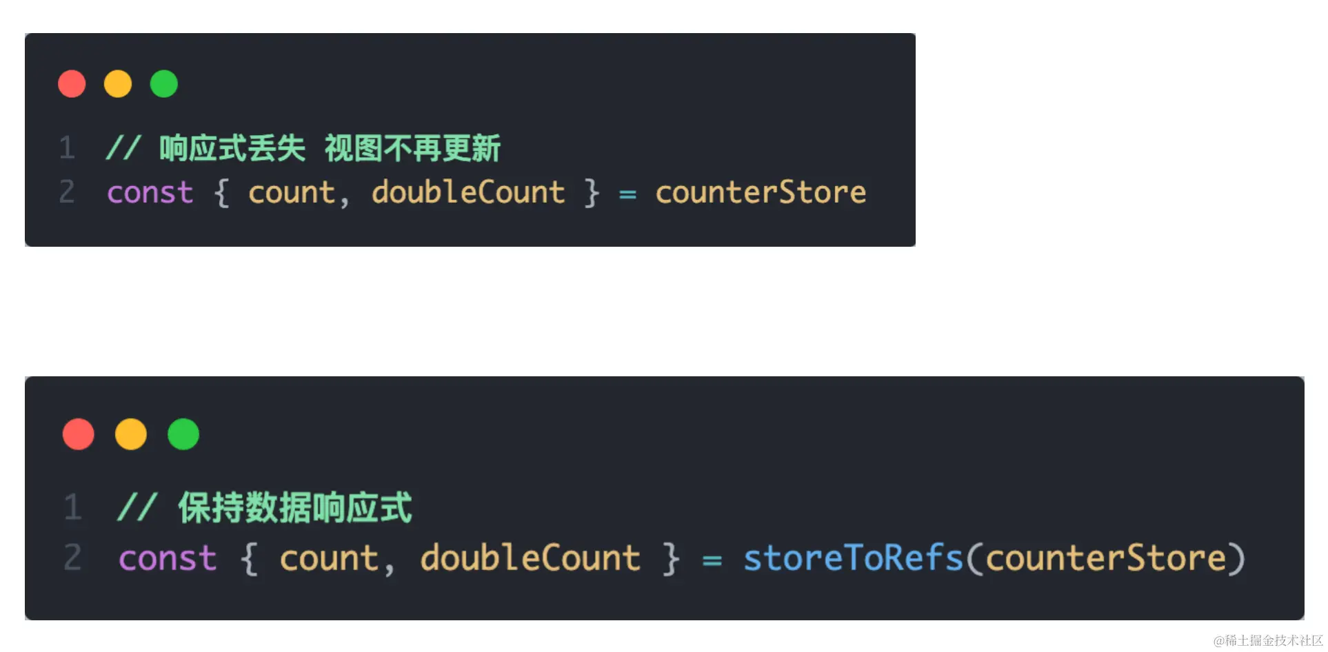 使用storeToRefs函数可以辅助保持数据(state + getter)的响应式解构