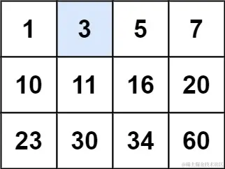 输入: matrix = [[1,3,5,7],[10,11,16,20],[23,30,34,60]], target = 3