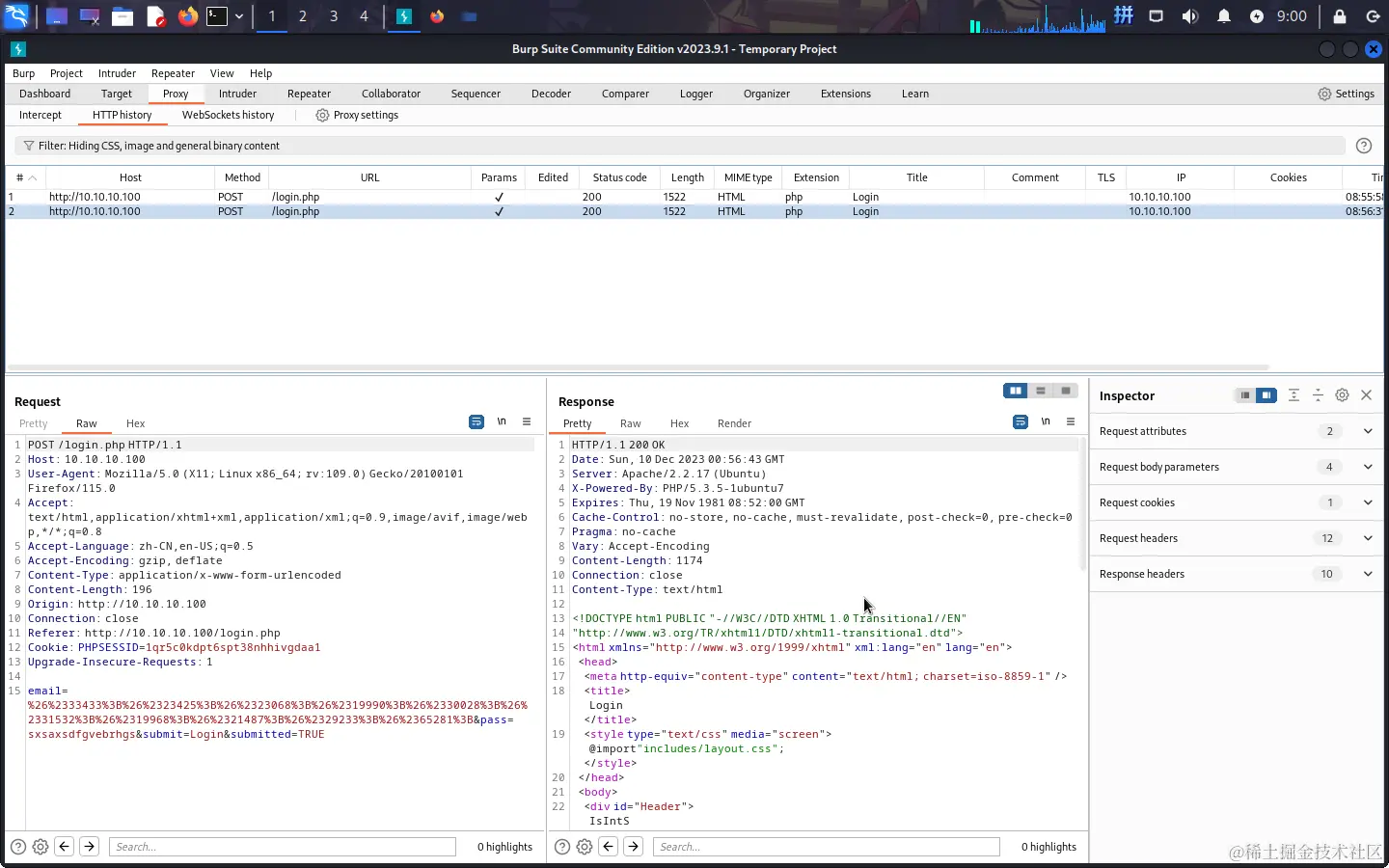 访问http://10.10.10.100/login.php,打开登录页面,随便填写用户和密码,然后打开BurpSuite拦截: