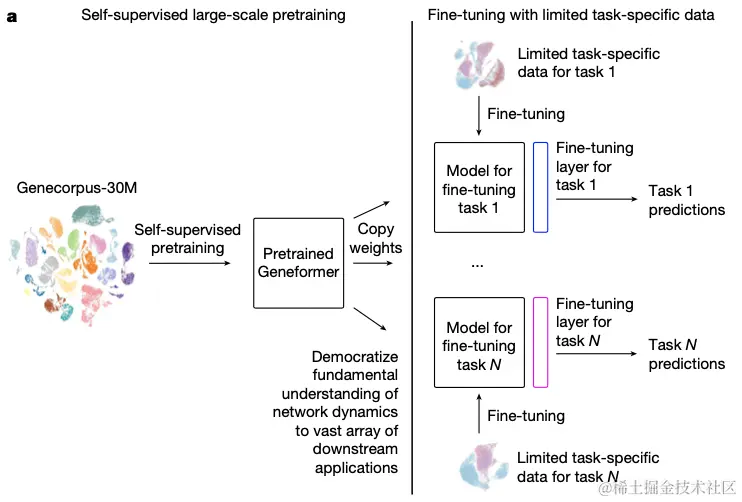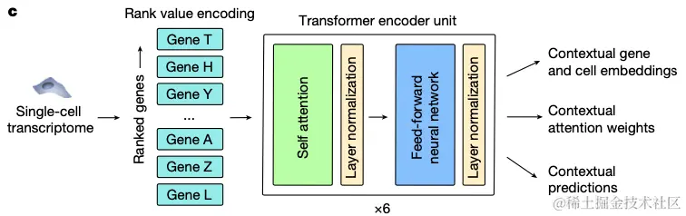 Geneformer采用基于注意力的深度学习模型,通过迁移学习在有限数据的网络生物学中进行预测。它利用自注意力机制关注每个单细胞转录组中表达的基因,优化给定学习目标内的预测准确性。Geneformer的架构允许对不同细胞类型、发育时间点或疾病状态下的网络动力学进行上下文特定预测。