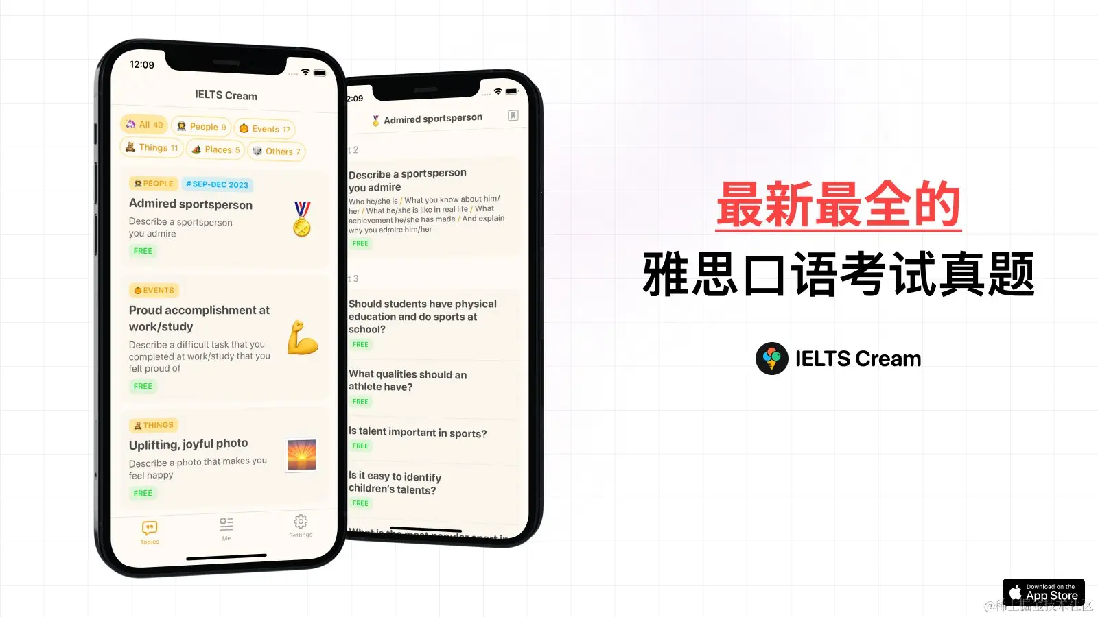 IELTS Cream 是一个基于 ChatGPT 的辅助 IELTS 口语备考的工具,不同于其他通用英语口语对话类 AI 工具,它更聚焦在雅思口语话题应试。有兴趣的小伙伴请下载试用,使用优惠代码 IELTSCREAMX 免费兑换3个月会员。作者@meterscao