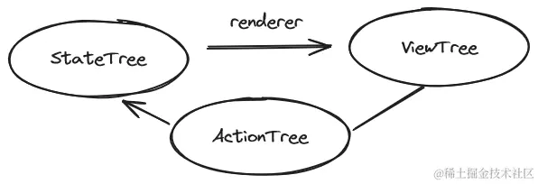所以前端的一个核心组织难点就是如何实现StateTree、ViewTree和ActionTree这三棵树之间的相互连接。