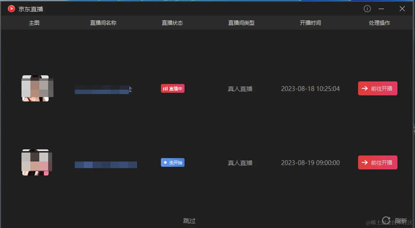 (3)登录京东直播工具,选择之前已创建好的直播间,点击前往开播(如选择跳过,则在下一步里,左上角点击选择直播间,选中需要开播的直播间进行推流