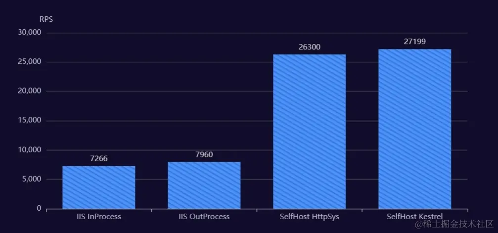 - IIS Host 不管是 In Process 还是 Out Process 性能也不差。就测试平台这种老古董也能跑个 7000+ RPS。这还不是极限,因为 7000 RPS 的时候 CPU 才到 50%+ 。如果我再多加一些线程,相信轻松可以过万。