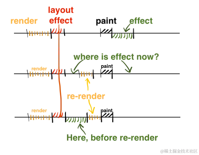 如果 useLayoutEffect 触发state更新时,那么effect必须在那次更新之前被刷新,即在绘制之前。下面是一个时间轴:
