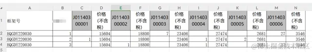 大佬们,这个Excel表格中,针对C列到N列,我想要取每一行的数字,最后输出一句话,如针对第二行数据的话最后生成:该订单对应7个J01140300003、27个J01140300006;第三行数据的话,最后生成:该订单对应1个J01140300001、1个J01140300004、2个J01140300005。请问该怎么进行代码实现呢?