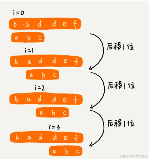 - 出错了就“将i后移1位”获取新的对比串,再从头开始对比