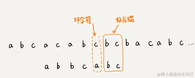 在上图中,bc 便是“好后缀”(其本质是:已核对正确的子字符串),好后缀有什么作用呢?