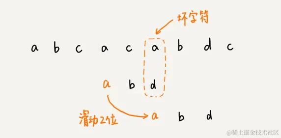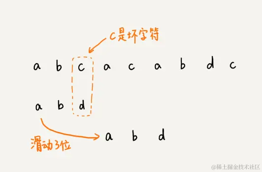 “坏字符”,顾名思义,便是比对不一致的字符(cd不一致,c便是坏字符)。
