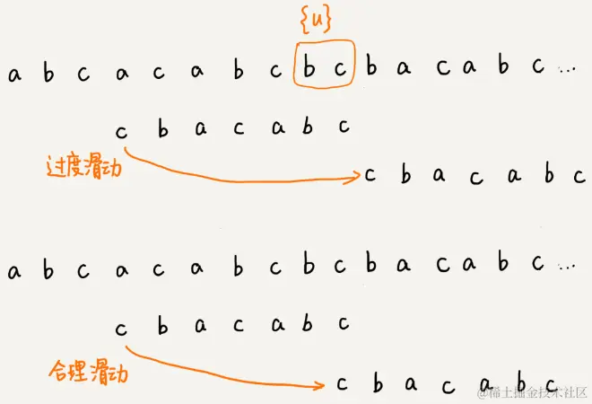 显然,如果有正确答案,答案必然包含“好后缀”,不包含“好后缀”的必然不是答案,因此我们可以通过在好后缀”的左侧寻找“一致项”来实现”移动多步“