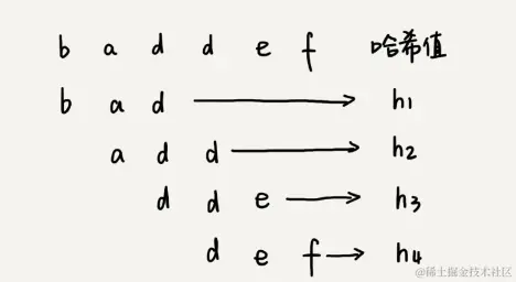 - 然后再遍历主串,比较对比串和模式串的hash值