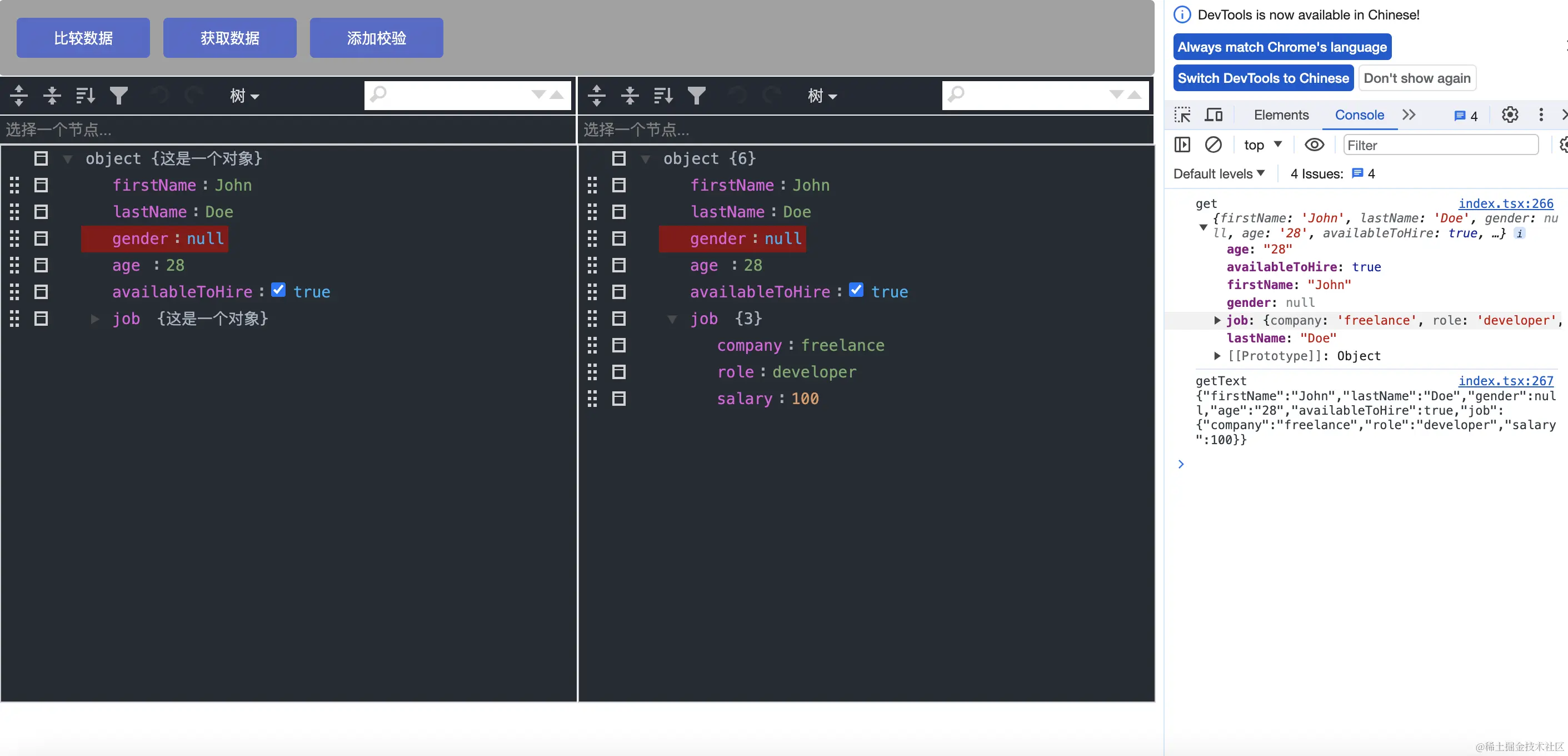 // 树模式还支持突出显示两个JSON文档之间的差异。