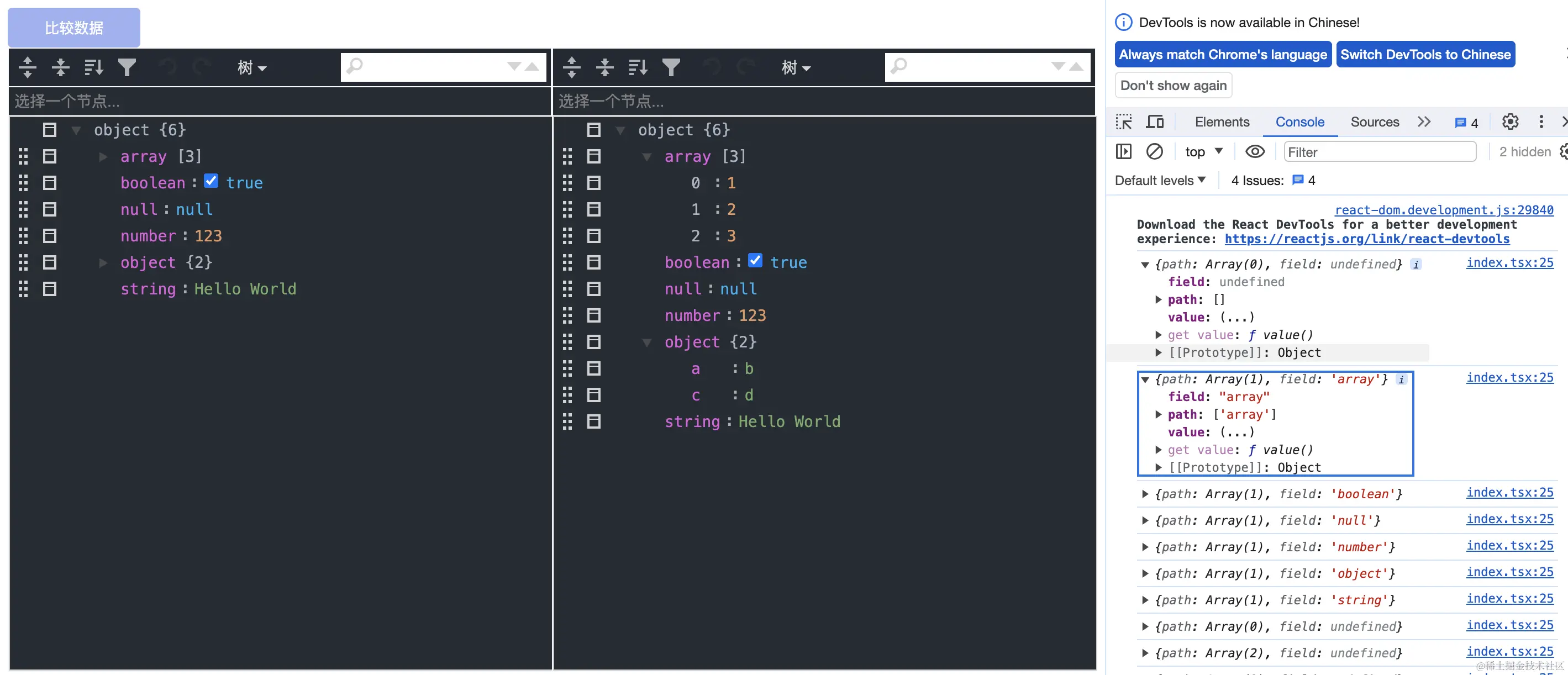 下面是我打印出来的onClassName的参数,可以看到是不能直接对两个值是否相等进行直接的比较,因为如果值可能是引用数据,这种情况下可以选择对数据进行递归比较,也可以选择直接跳过就可以了,因为接下来还会编辑这两个对象的属性节点,相比来说这样更加节省性能,并且相同的路径能取出来类型相同的引用类型数据的话基本就没有在比较的意义了,后面比较他们的属性即可