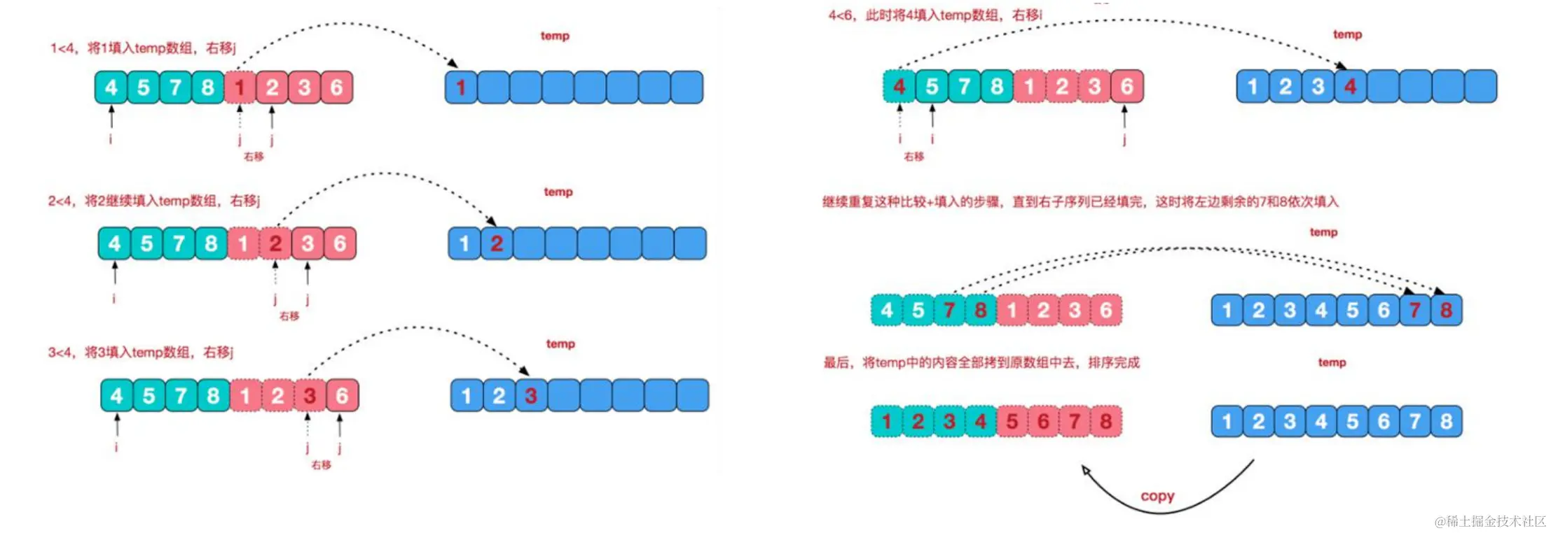 public static void merge(int[] num, int[] temp, int left, int middle, int right) {