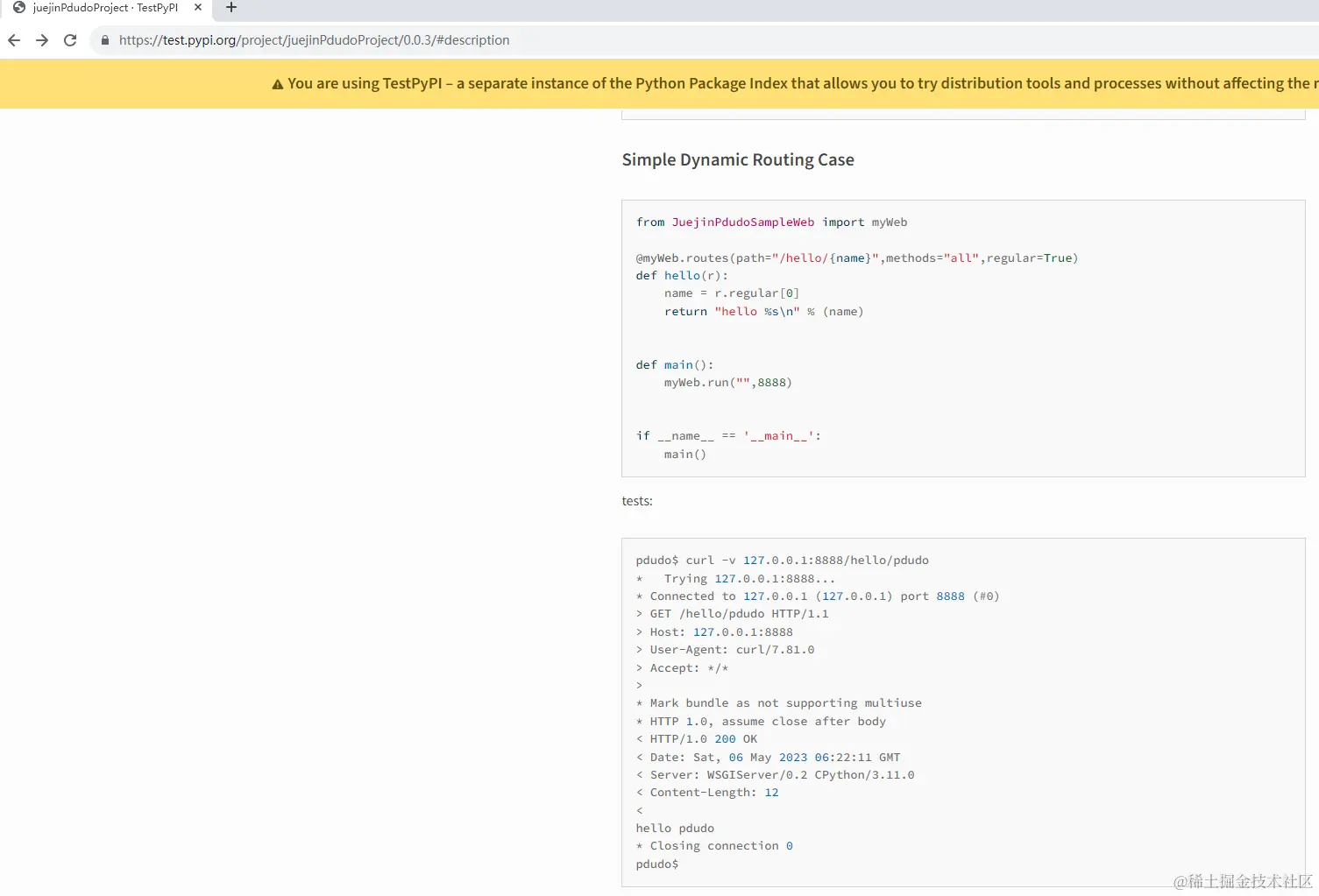 它最初探寻了WSGI标准,而后围绕该标准写了一套属于自己的web应用框架,并且支持动态路由,设置、读取cookie,设置basicAuth等等,最后将其上传到了pipy仓库(test.pipy)。