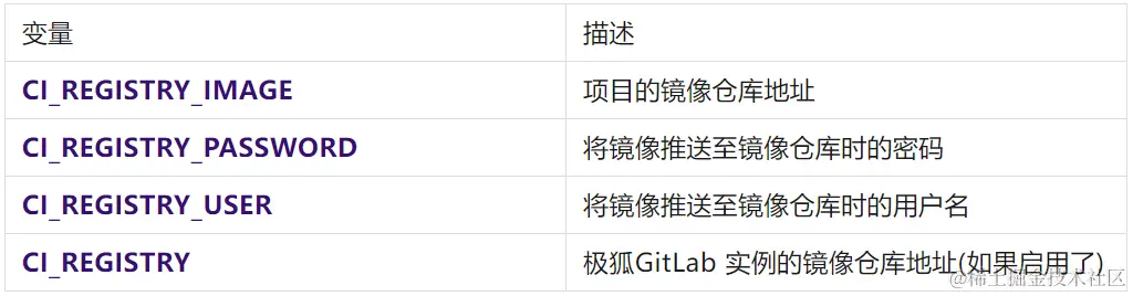 CI_REGISTRY_IMAGE 和 CI_REGISTRY 的却别就是一个是项目级别的镜像仓库,一个是实例级别的镜像仓库。另外,至于 CI_REGISTRY_USER 的值是 gitlab-ci-token 而不是用户登陆极狐GitLab 的用户名,这个且听后面文章对于镜像仓库具体使用时的分解。