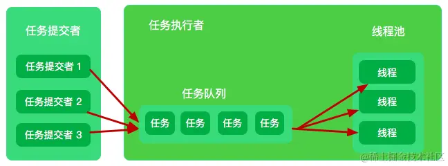 Executor 接口提供了一个 execute() 方法将 Runnable 实例提交到线程池中执行。