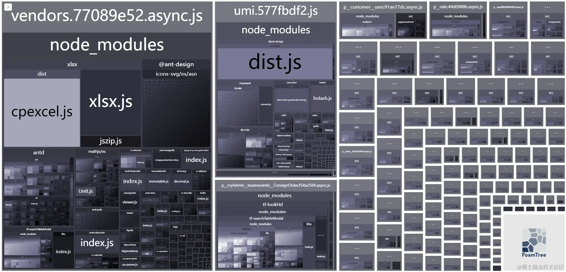 // 如果开了 dynamicImport,然后产物特别大,每个出口文件都包含了相同的依赖,比如 antd,可尝试通过 splitChunks 配置调整公共依赖的提取策略。