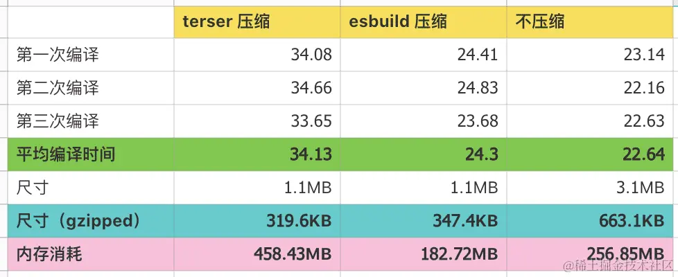 编译慢中压缩时间占了大部分,所以如果编译时不压缩可节约大量的时间和内存消耗,但尺寸会增加不少。替换terser压缩器为esbuild,来提高编译速度。